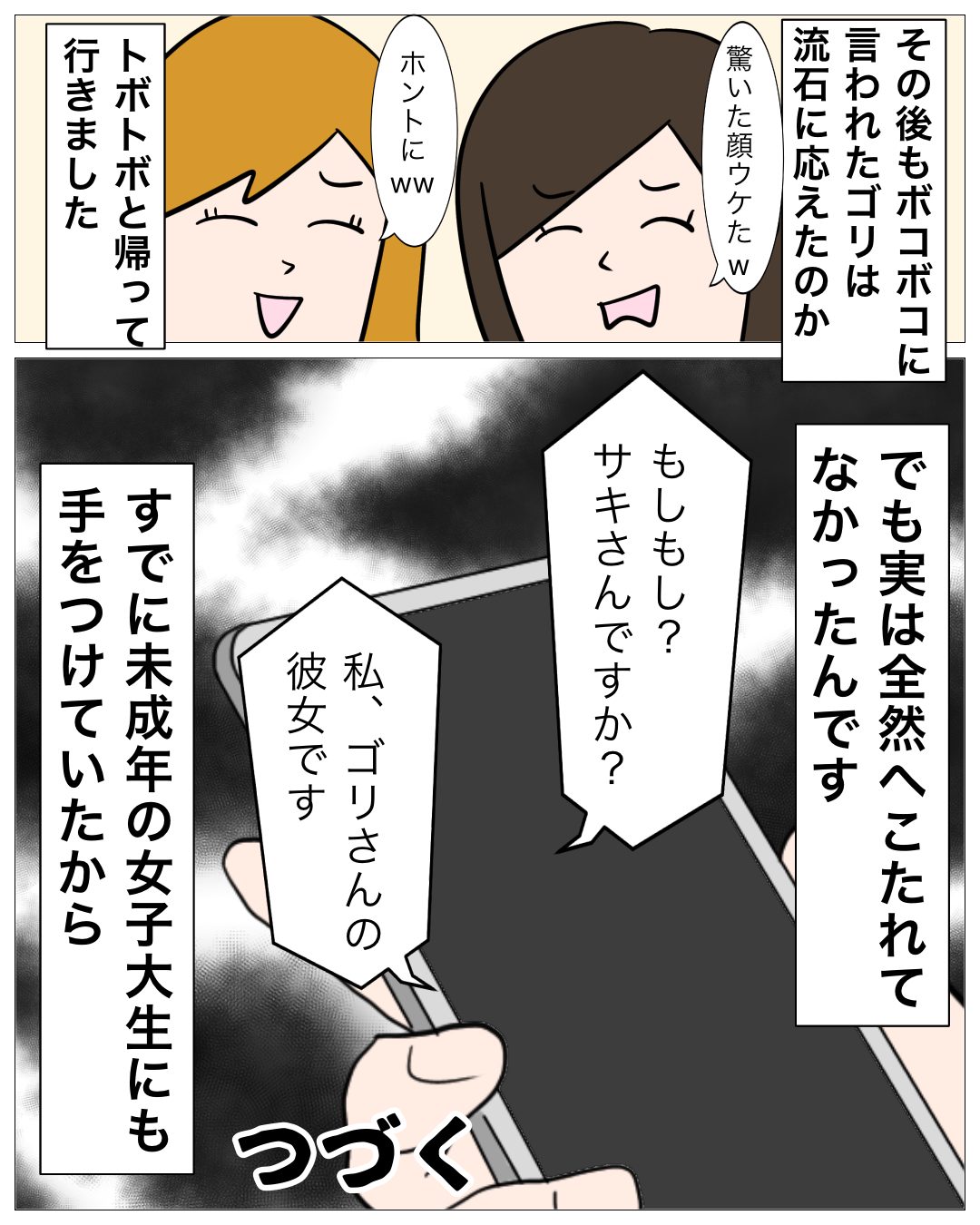 ↓前回のお話はこちら ↓1話目はこちら 電話の相手は・・・ あとがき 今度は女子大生を捕まえて風俗に沈めようとしてる? この女子大生は何者? 次回もお楽しみに!