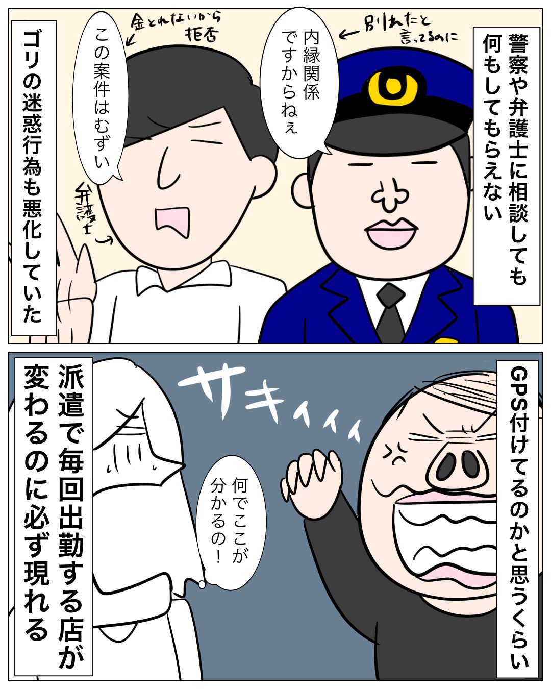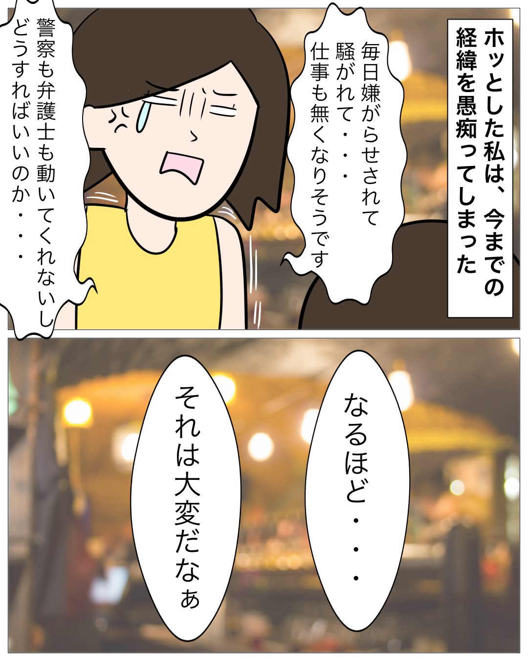 ↓前回のお話はこちら ↓1話目はこちら どうにもできない あとがき 警察は何もしてくれない、弁護士も受けてくれない。 あなたならどうしますか? サキさんは・・・ 次回もお楽しみに!