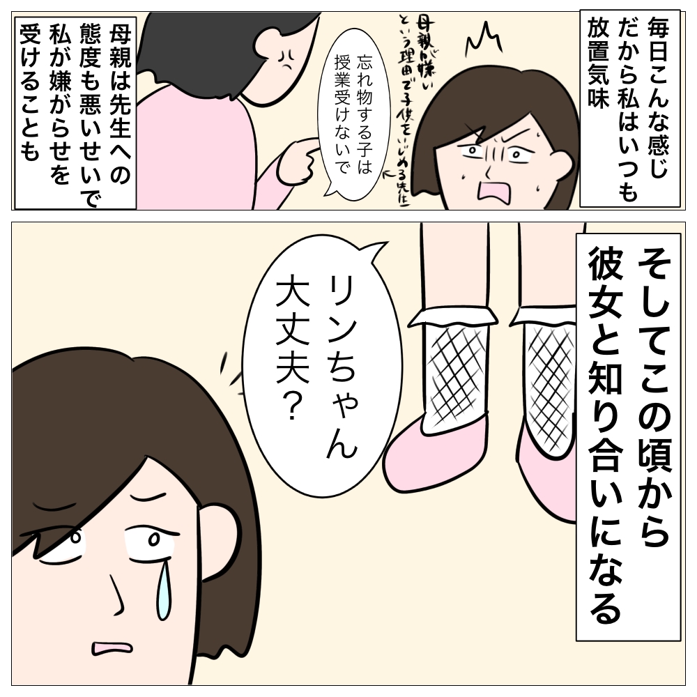 そのせいもあって、母親はリンさんを放置するだけでなく、周りへの態度も悪いから先生にいびられる日々・・・。